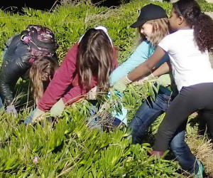 Volunteers love working at the waterfront, so work on the beach mushroomed. We established a now dense cover of native shrubs on the steep south edge of the beach. A Boy Scout Eagle project built steps. Big work parties of young folks removed ice plant that covered much of the beach. This was followed by years of pulling and digging Pampas grass, French broom, thistles, poison hemlock, fennel, blackberry, and more. In the areas cleared of weeds, we planted creeping wildrye and beach evening primrose – which spread rapidly — along with other natives. Others washed in or sprang up on their own: tules, gum plant, native Limonium, salt marsh heliotrope, and more. As saltwater encroaches, some of these are now dying, along with the native willows close to the shoreline.